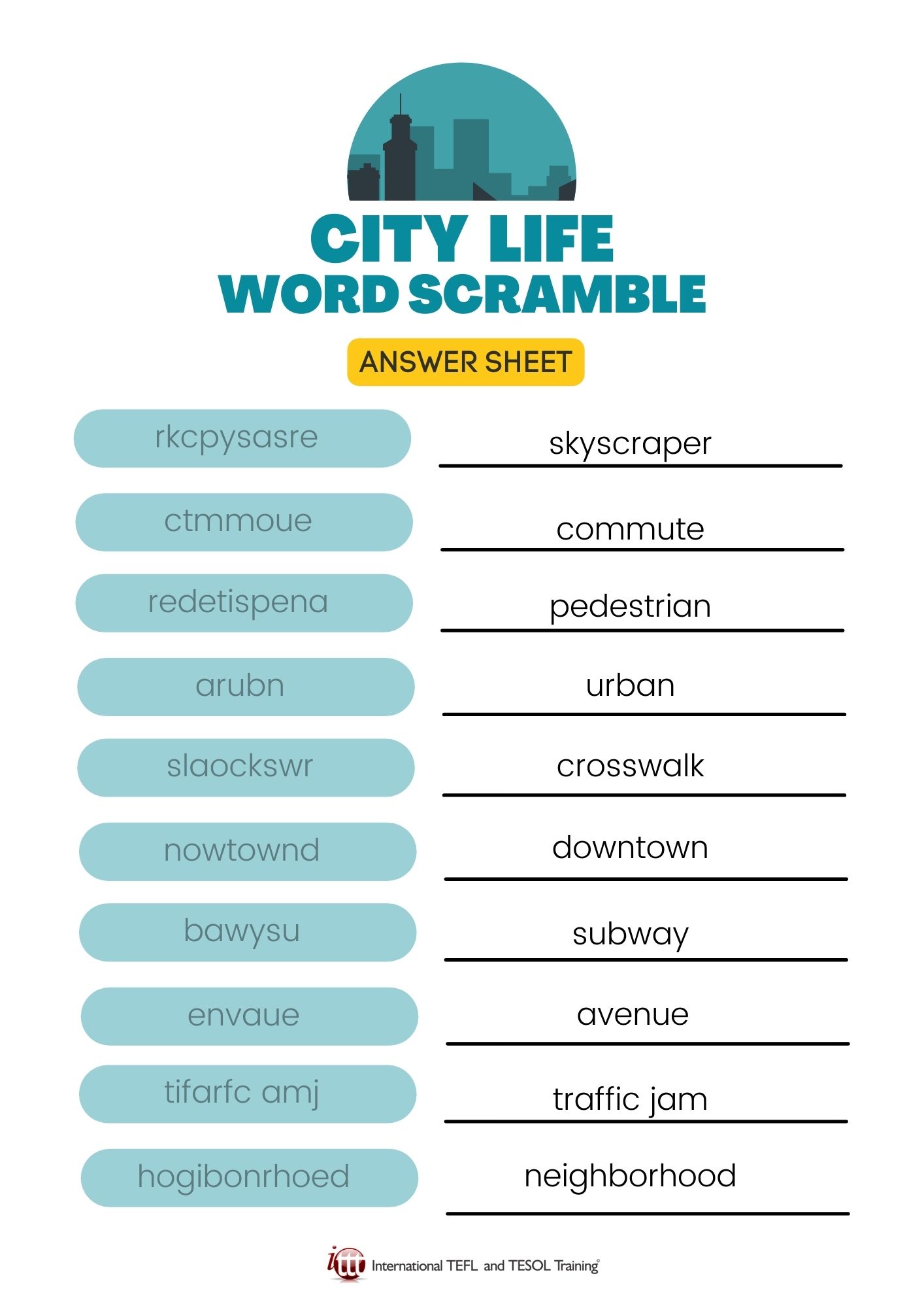 Here's a fun EFL word scramble with words related to city life.