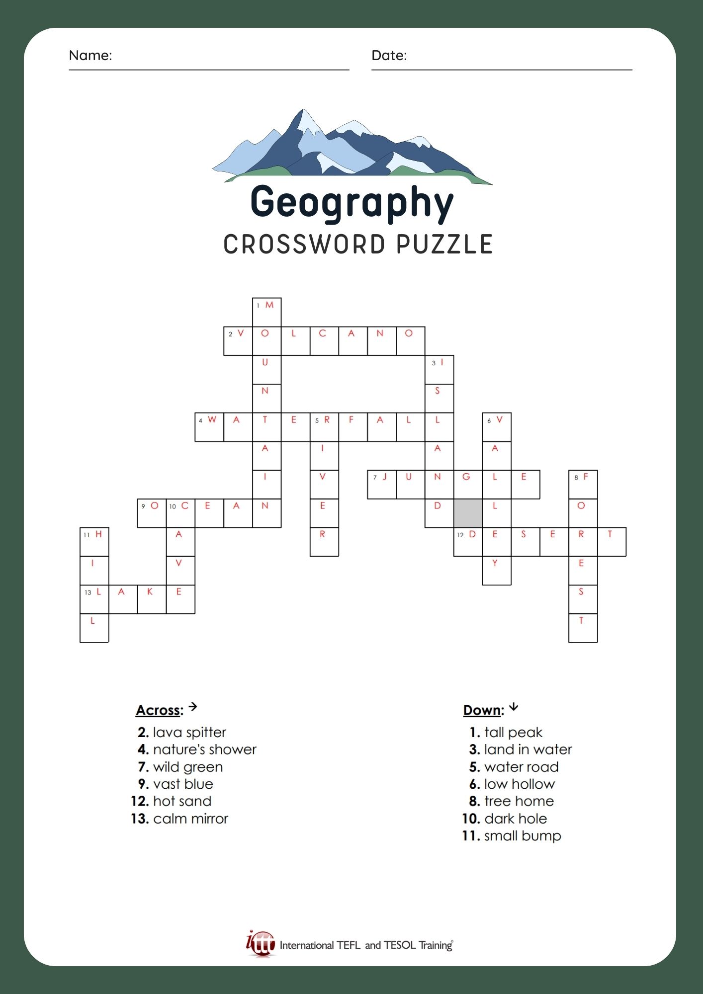 Here's a fun EFL crossword puzzle with words related to geography vocabulary.