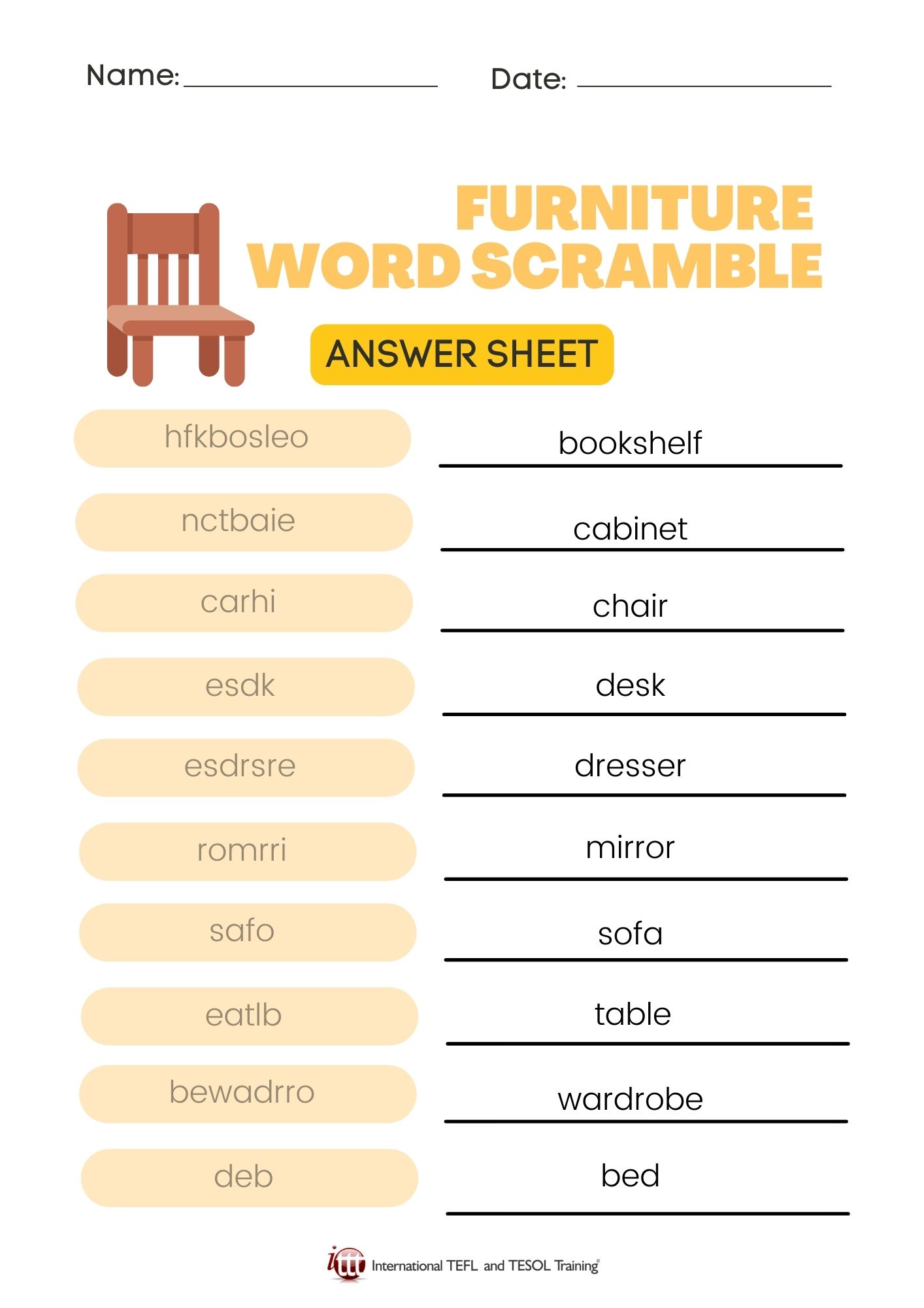 Here's a fun word scramble with words related to home and furniture.