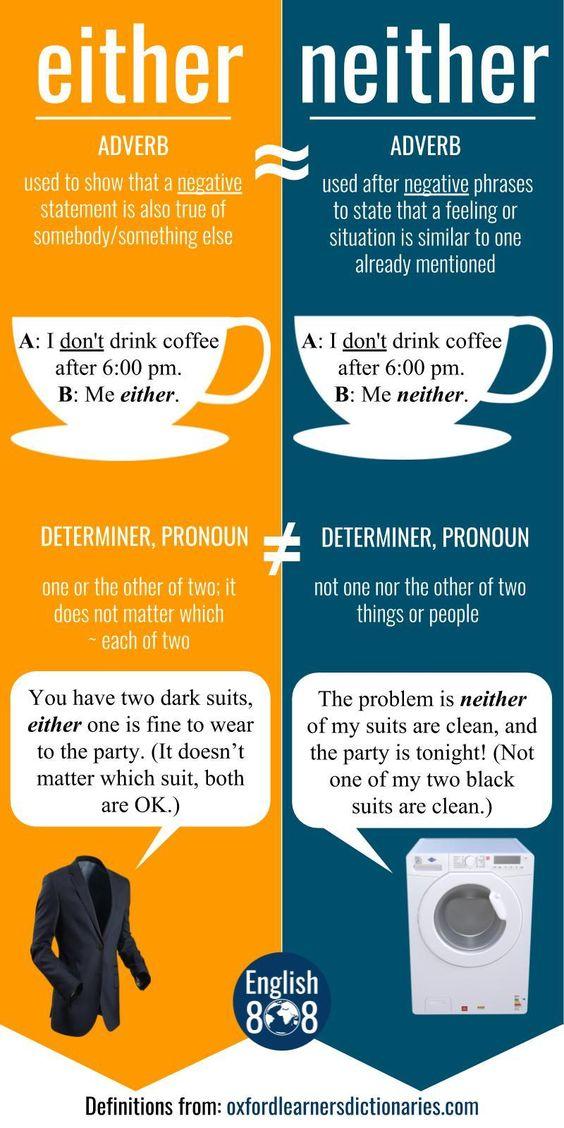 The words "neither" and "either" are often confused by English learners around the globe. The word "either" sometimes has a similar meaning as the word "neither" but they are often used incorrectly. Below, we take a look at the differences so you can use (and teach!) these words correctly and with confidence.