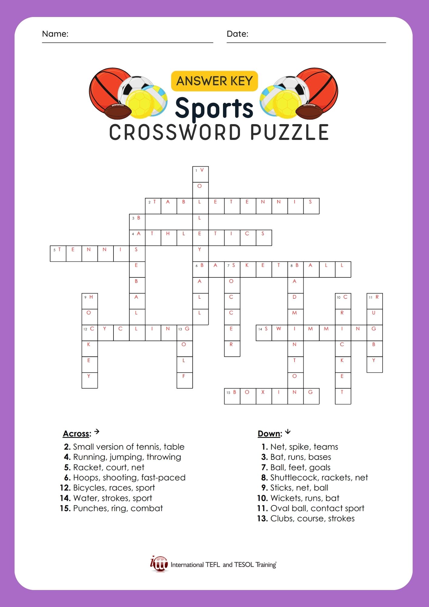 Here's a fun EFL crossword puzzle with words related to sports.