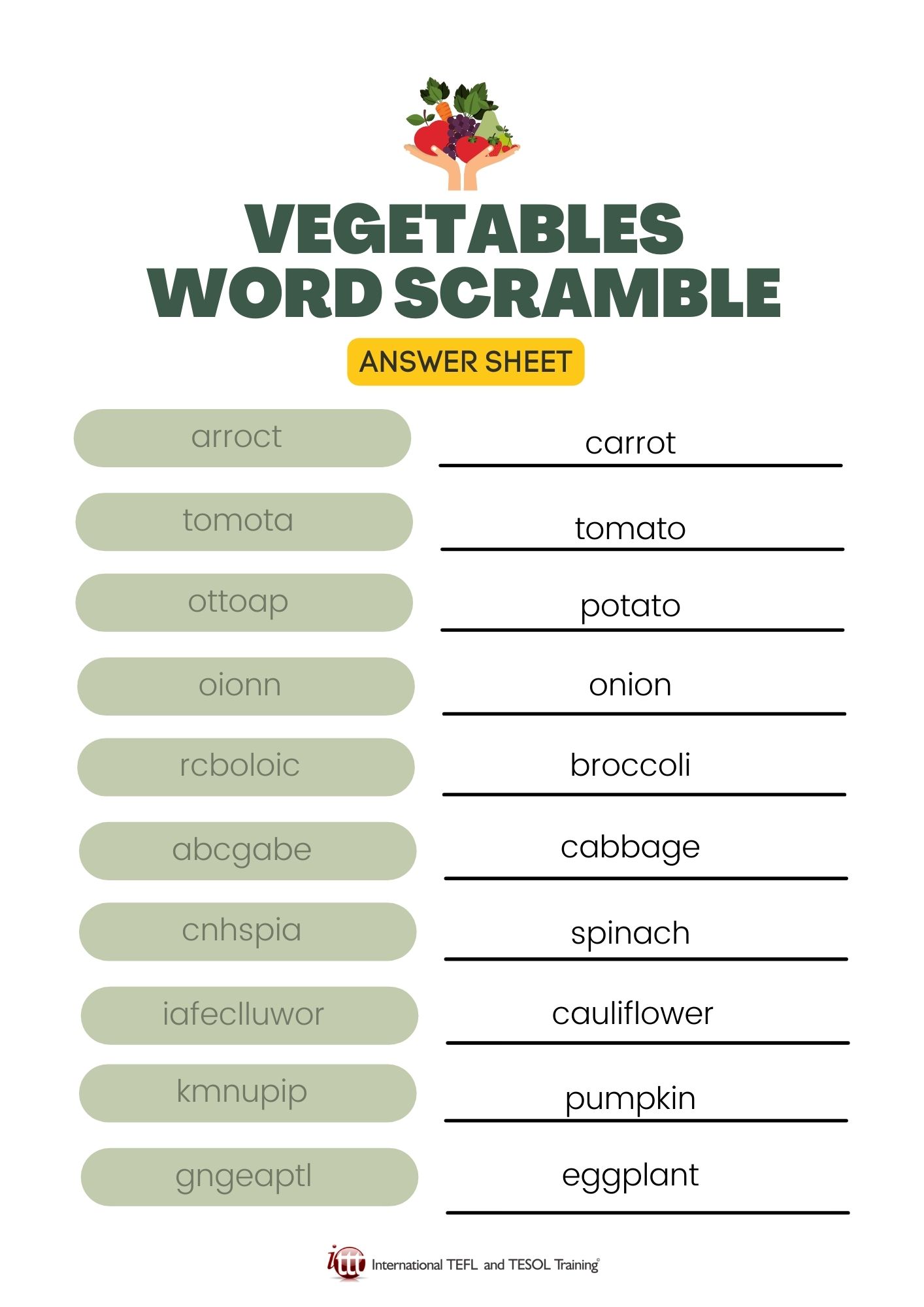 Here's a fun EFL word scramble with words related to vegetables.
